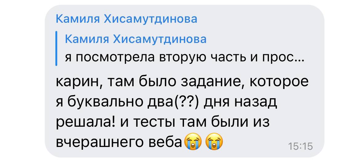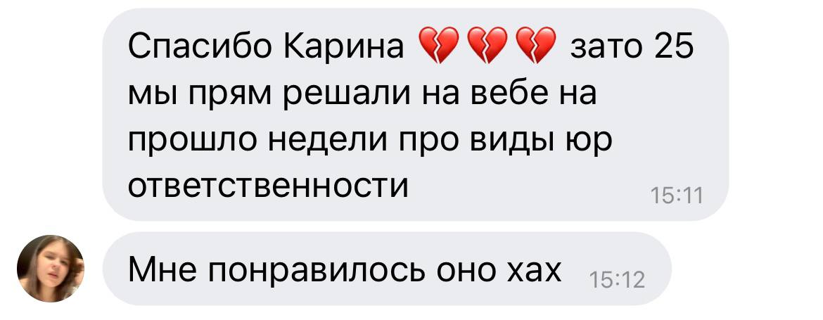 Помимо этого, Карина создаёт просто суперскую атмосферу на курсе, постоянно навещая чаты курса и общаясь с учениками, что очень сближает и делает подготовку по-дружески расслабленной и приятной!!